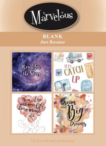Featuring the best selling designs inspired by Trader Joes featuring Louisiana artist Allison Matherne. Enjoy these four color interiors with plenty of space to express yourself with thanks, encouragement, inspiration and even passing along some wisdom. Includes cover art with Let's Catch Up, Reach for the Stars, Be in Love With Your Life Every Minute of it, and Dream Big Dreams. These 6 5/8" x 4 3/4" size cards come in four designs, packed three each along with 12 white envelopes.