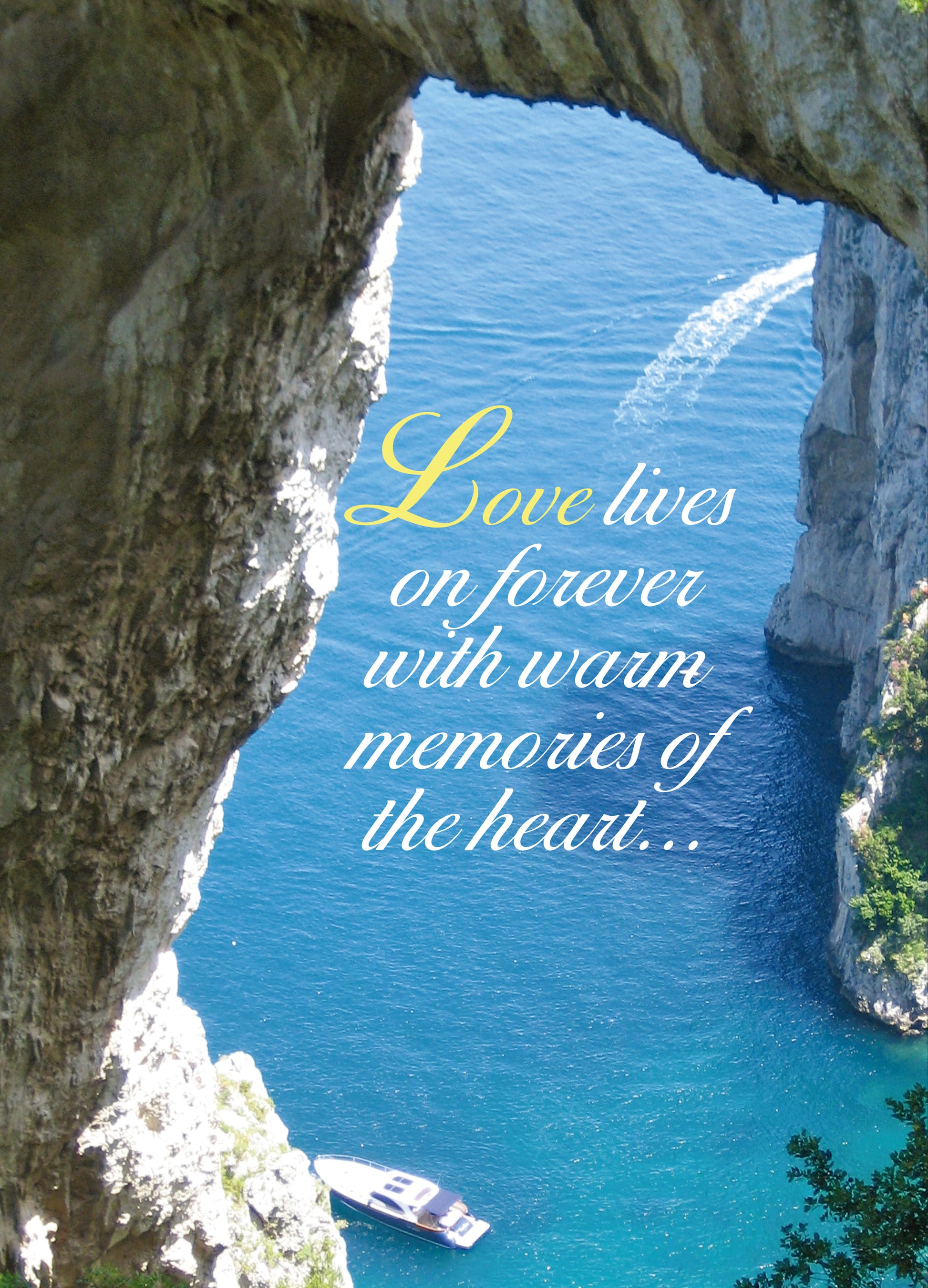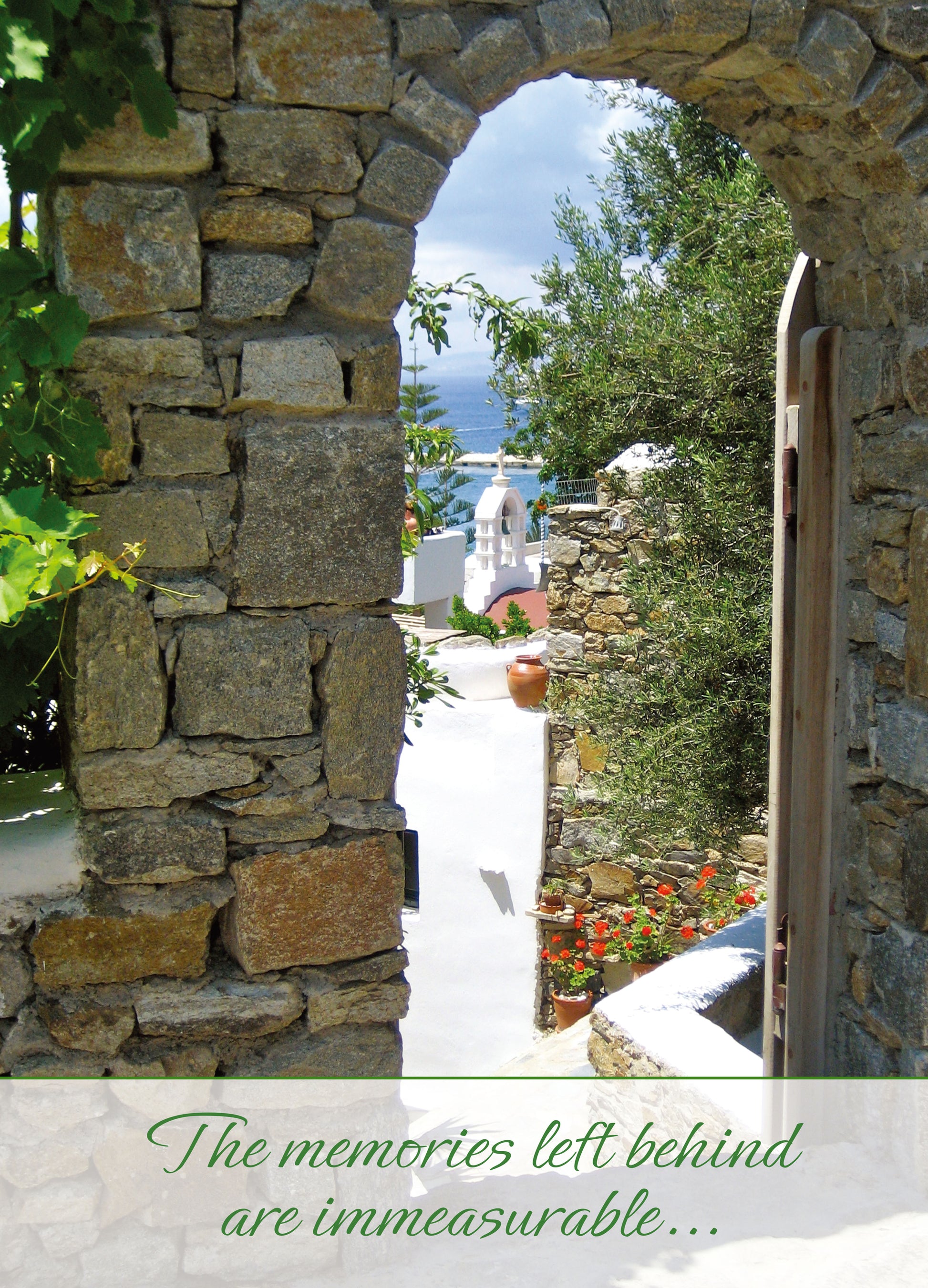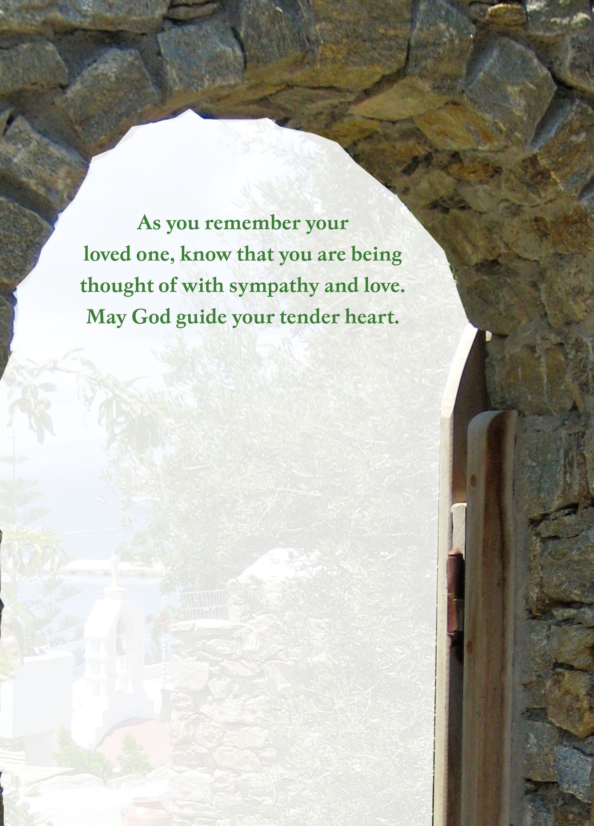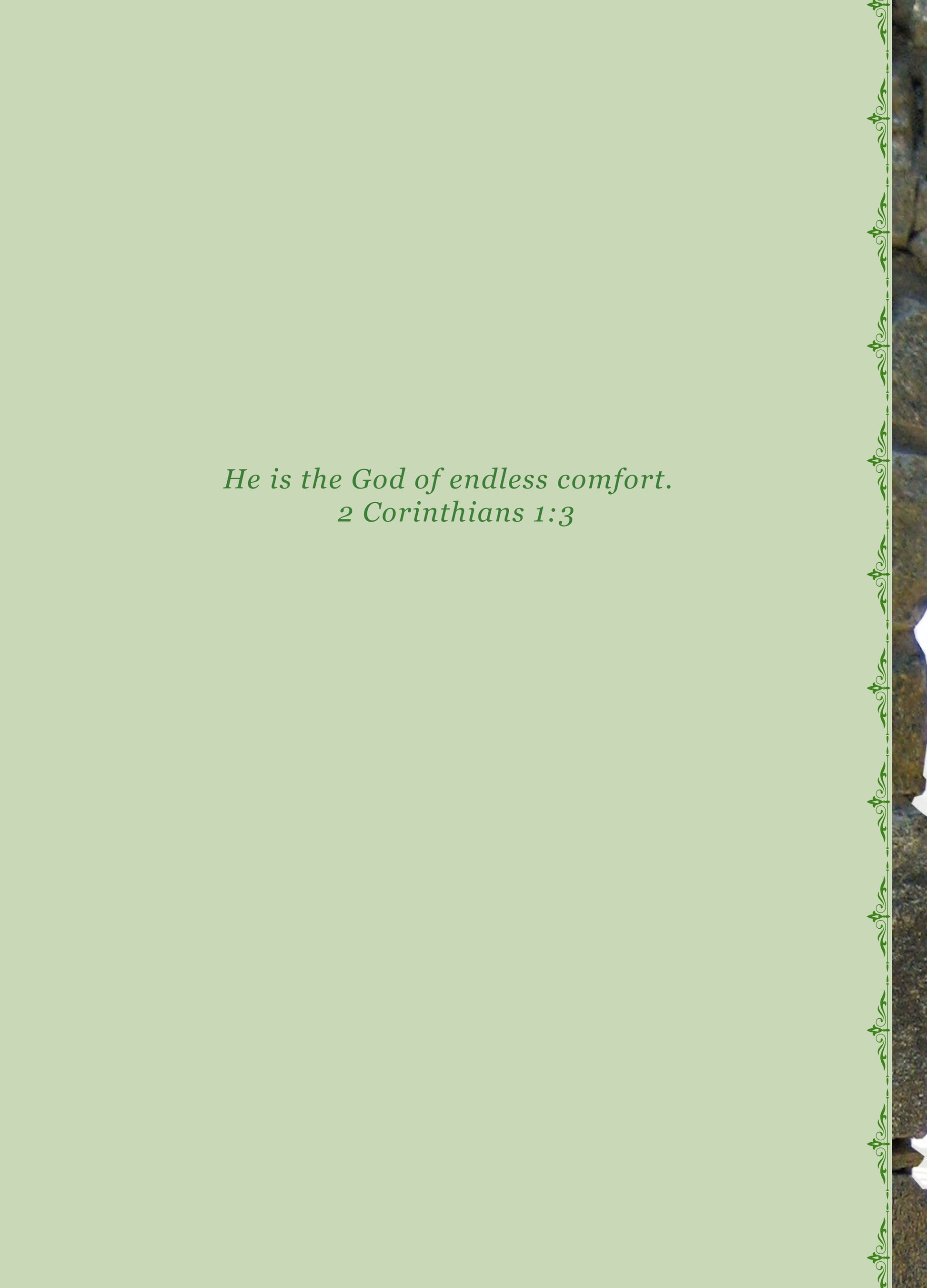 Card C: The memories left behind our immeasurable. Interior: He is the God of endless comfort. 2 Corinthians 1:3 Page3: As you remember your loved one, know that you are being thought of with sympathy and love.