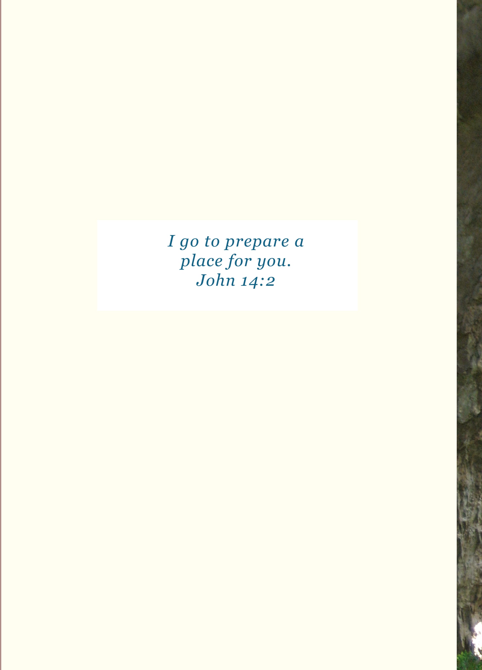 Card B: Remembering you in prayer and trusting God. Interior: The memories left behind our immeasurable. Interior- God the source of love and peace will mingle with you. 2 Corinthians 13:11 Page 3-Praying for comfort and strength at this time of loss.